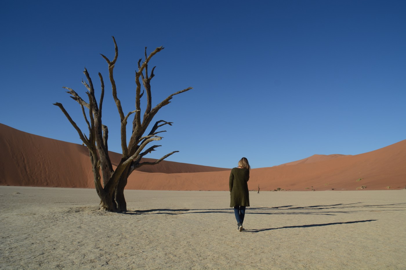 Am nächsten Morgen packten wir dann noch im Dunkeln unser Zelt zusammen und rollten um halb sieben schon vom Campingplatz. So waren wir mit die Ersten, die bei den Dünen ankamen. Während Johanna und die zwei Praktikantinnen den mühsamen Aufstieg der höchsten Düne in Angriff nahmen, spazierten Sascha und ich ganz gemütlich ins Deadvlei und warteten in der Sonne auf die Dünenkletterer. Nach mehr als zwei Stunden waren die dann auch wieder bei uns angelangt und wir konnten uns auf den Rückweg machen.